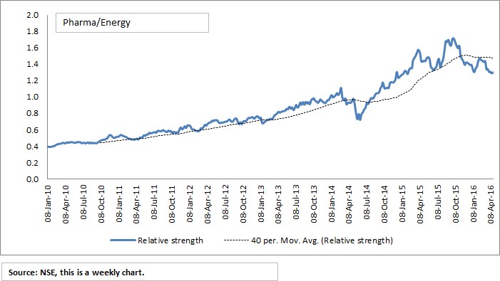A look at the ratio of the Pharma Index divided other Indices shows that the Pharma index might be a huge under-performer going forward. The ratio is below its 40 week moving average for all sectors and the broader Nifty and 10 year bond index too.